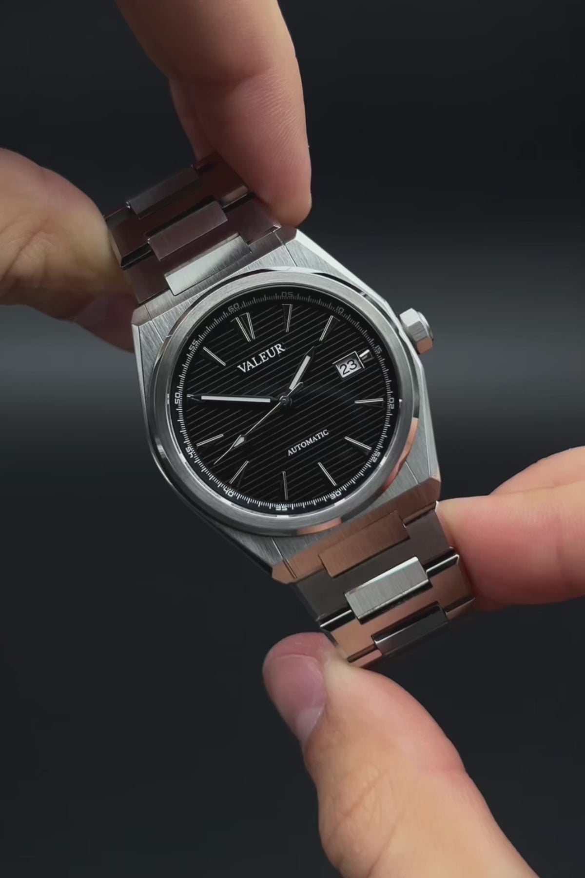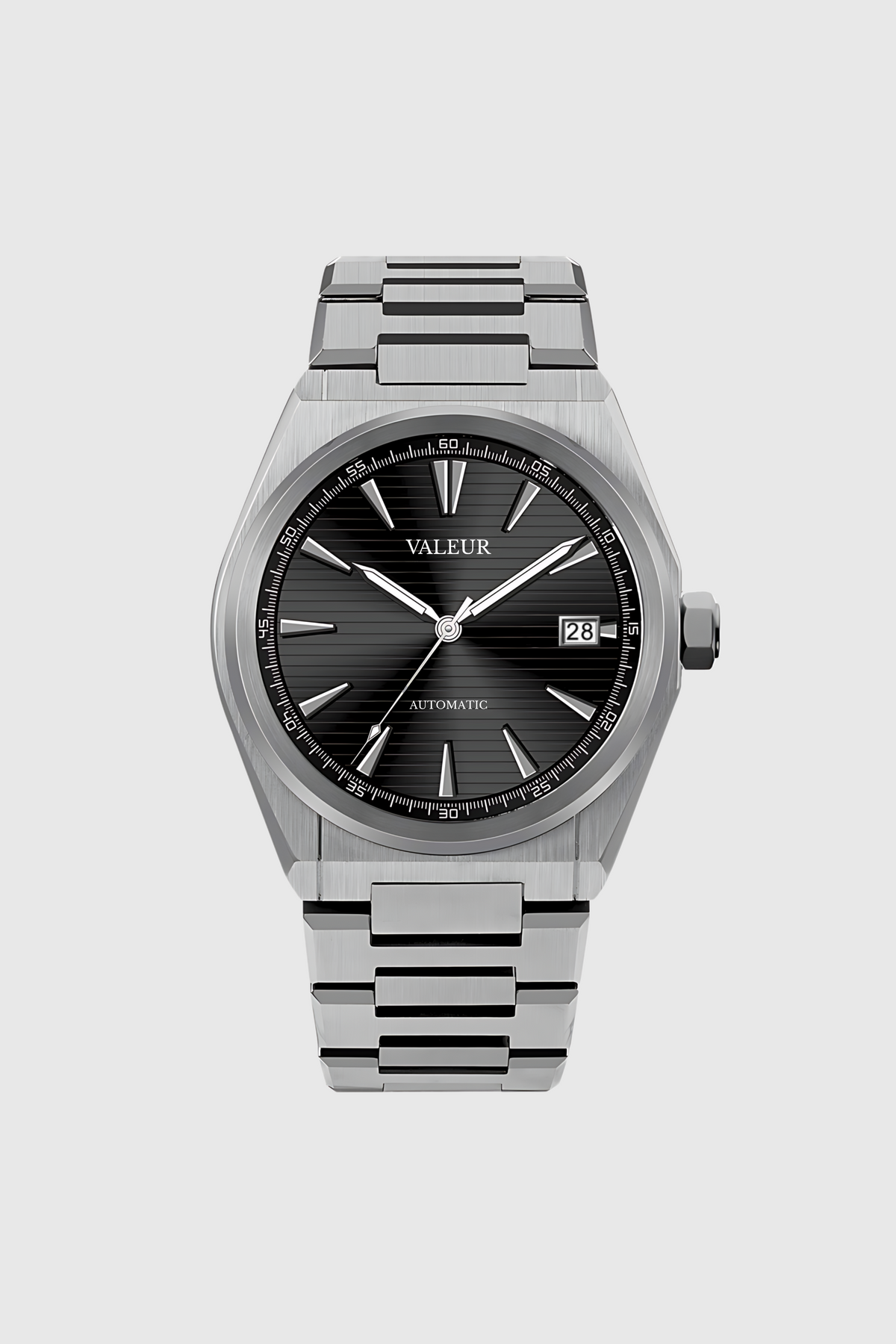 Introducing the Valeur Prestige Watch – a classy 40mm timepiece featuring a sunburst black striped dial, butterfly clasp, and 10ATM water resistance. Powered by the reliable NH35 automatic movement with a 41-hour power reserve and date function.